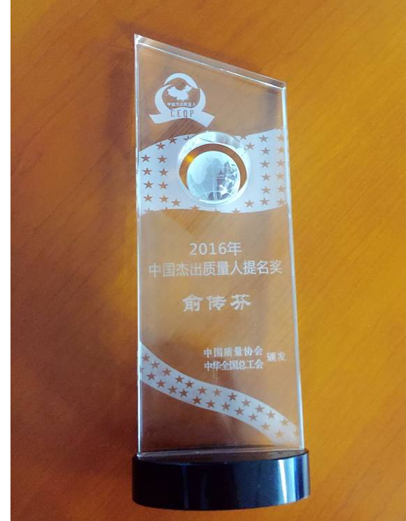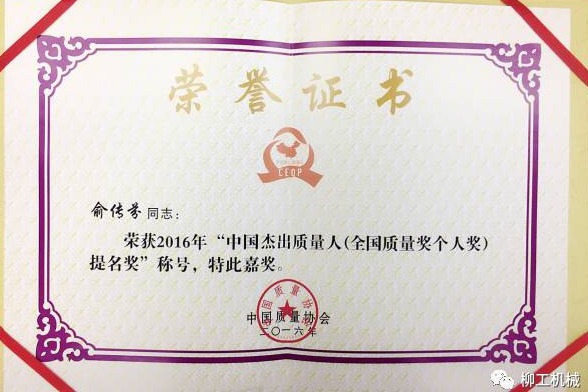 2016年12月14日,北京—今天,由中国质量协会和中华全国总工会以“创新驱动—迈入质量时代”为主题开展的2016中国杰出质量人(全国质量奖个人奖)推选活动落下帷幕。广西柳工机械股份有限公司总裁俞传芬荣获2016中国杰出质量人提名奖。