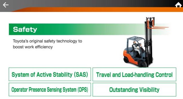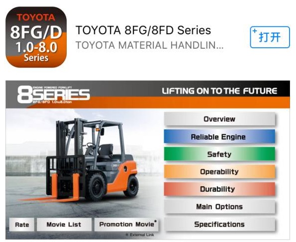 首先,免费免费免费,重要的事情说三遍。您可以在APP Store或者安卓系统的Google Play中搜索“Toyota Material Handling Group”找到 8FG/D1.0-8.0 Series。