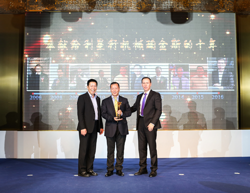 星行机械集团首席执行官傅耀生与 Perkins 环球销售及营销兼服务及零部件副总裁辛恪礼向利星行机械珀金斯业务总经理王宏伟送上奖牌,表彰他为 Perkins 代理业务作出的贡献。