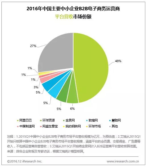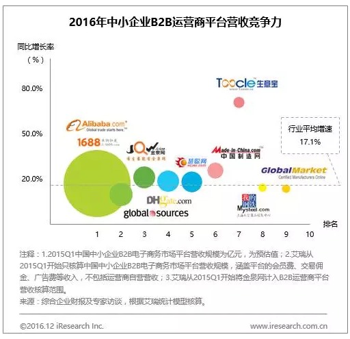 在2016年中小企业B2B电子商务运营商平台均保持稳定的增速。核心Top9企业中, (1)阿里巴巴营收规模最大,且保持与其他企业同等的增速,竞争优势明显;(2)网盛生意宝增速最高,约为其他企业一倍,竞争潜力大(3)其余企业2016年营收规模和增速大致相当,保持稳定的竞争力。