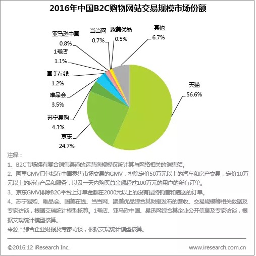 市场份额:B2C市场天猫、京东继续保持优势,其他典型企业竞争激烈