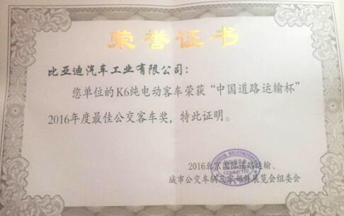 12月份,在由中国客车网、中国土木工程学会城市公共交通分会举办的影响中国客车业系列活动上,比亚迪K6纯电动公交车再次获选“影响中国客车业-2016年度中国客车行业微公交客车之星”及“影响中国客车业-2016年度智能化客车之星”;同时在此次活动中,比亚迪纯电动公交领域的另一代表之作——K8纯电动公交车也荣获 “影响中国客车业-2017年度中国客车行业推荐新能源客车”。