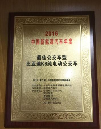 同月,在工业和信息化部赛迪研究院、新能源汽车报举办的2016(第二届)中国新能源汽车领袖峰会上,比亚迪K8纯电动公交车又摘得一枚大奖,荣膺“2016年度新能源汽车最佳公交车型奖”。