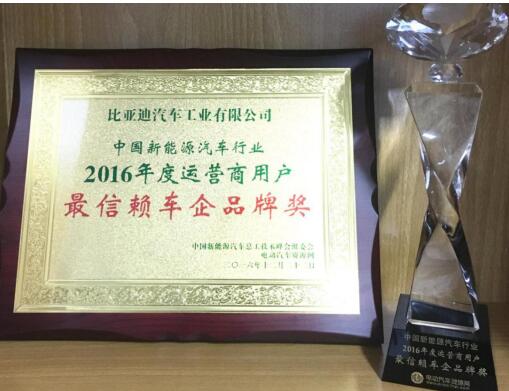 在电动汽车资源网举办的中国新能源汽车总工技术峰会上,比亚迪获得“2016年度运营商用户最信赖车企品牌奖”,充分体现了比亚迪新能源汽车产品极高的客户口碑。