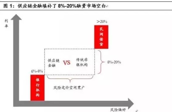 供应链金融最大创新在于填补8%-20%的融资利率空白,打开中小企业融资阀门。理论上银行是中小企业最理想的融资对像,成本在6%-8%之间。但从收益风险配比角度看,银行更愿意将资金大门向大型企业敞开,而不愿承受过高风险。