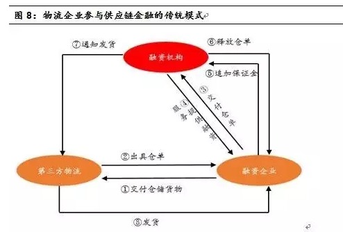 第三方物流企业发挥上下游桥梁优势,拓展自身业务空间。物流公司具有专业的货物存储管理、丰富的买卖双方的交易信息,在存货抵押为主要形式的供应金融中具 备优势,如仓单质押授信模式,物流企业具备充足的优势。物流企业亦可以通过搭建互联网交易平台,更深入的渗透供应链金融。