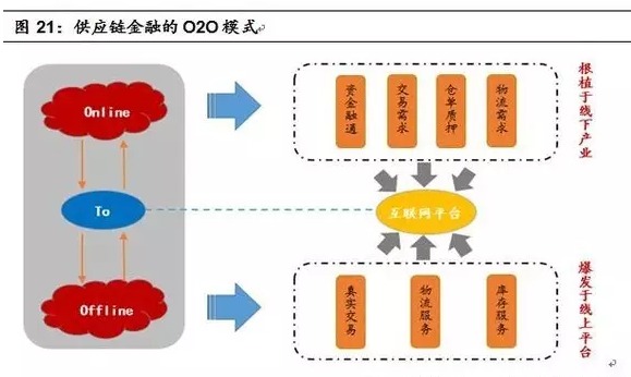 扎根于产业,供应链金融O2O生态更接地气。与传统金融机构相比,核心企业更易搭建供应链融资生态。在发展成熟阶段,供应链金融将在产品、物流、仓储、资金融通等多个维度建立起以核心企业为中心的生态系统,而互联网从消费到产业、从个人到企业的渗透加速了供应链金融生态的成型。与金融机构只做金融业务相比,供应链金融在产品业务端对上下游企业更具粘性,且相比于产品消费端的O2O模式更具产业根基。