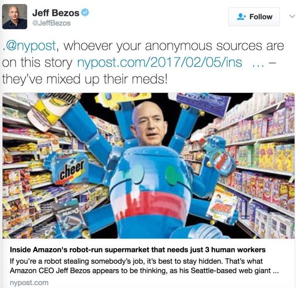 近日《纽约邮报》曾报道亚马逊计划开设自动化杂货店,亚马逊官方还未对此消息发表评论,CEO杰夫·贝索斯(Jeff Bezos)就开始按捺不住,并在个人Twitter上予以否认。