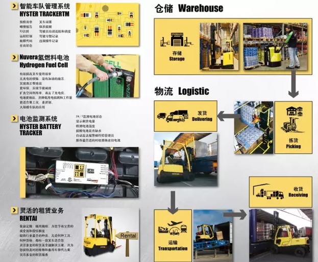 海斯特已不仅仅是叉车制造商,从车队管理系统到仓库模拟系统和车载称重系统,从氢燃料电池到电池检测系统,再到完善的售后维修服务体系,配以叉车属具、蓝光灯等其他相关产品,海斯特致力于为客户提供全方位的一站式物流解决方案。其产品目前已广泛应用于中央仓库、电商物流、邮政公司、航运物流等各个行业。