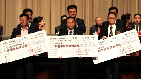 天能集团董事长张天任(中)上台领取工业企业突出业绩奖