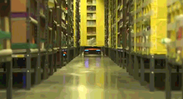 提到仓库机器人,我们首先会想到的可能是亚马逊家的长得像吸尘器一样的 Kiva,它能在找到货物后,直接将货架“扛到”工作人员身边,像这样: