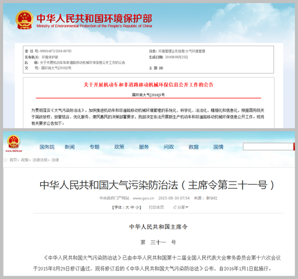 2016年1月1日生效的《中华人民共和国大气污染防治法 》将非道路移动机械纳入管理范围,对非道路移动机械违反《中华人民共和国大气污染防治法》排放大气污染物的处罚做了严格的规定,并制定了一系列具体的、有针对性的措施,规定了相应的处罚责任,确了责任主体和处罚标准,执行信息公开,接受全社会监督,监管力度、执法处罚力度前所未有。
