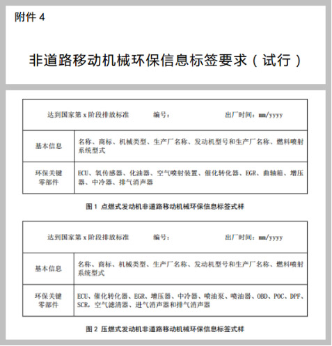 2016年8月,中华人民共和国环境保护部发布了《关于开展机动车和非道路移动机械环保信息公开工作的公告》,公告明确规定:从2017年7月1日起,非道路移动机械生产、进口企业应将新生产、进口非道路机械的环保信息予以公开,非道路移动机械生产、进口企业在产品出厂或货物入境前,在机身明显位置粘贴环保信息标签,公开主要环保信息,包括排放检验信息和污染控制技术信息,并对信息公开的真实性、准确性、及时性、完整性负责。