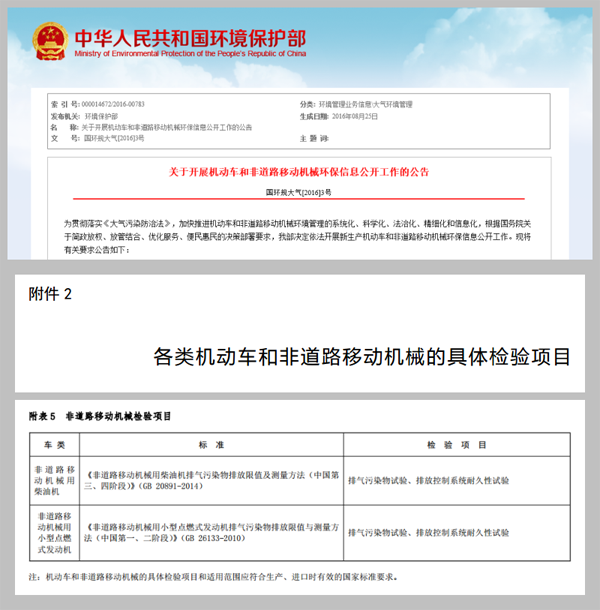 2016年1月1日起,第二次修订的《中华人民共和国大气污染防治法 》开始生效;2016年7月,环保部、公安部、认监委联合发文《关于进一步规范排放检验加强机动车环境监督管理工作的通知》;2016年8月,环保部发布了《关于开展机动车和非道路移动机械环保信息公开工作的公告》,在公告中明确了各类非道路移动机械的具体检验项目;同时,国家《在用非道路柴油机烟度排放标准》正在制定中,预计今年上半年发布征求意见稿,预示着非道路移动机械T3排放标准检测及联合执法将在今年全面实施。