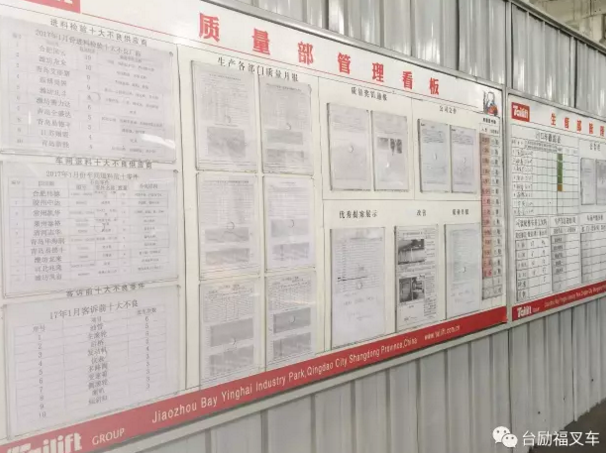 为了提高公司的生产与质量管理,台励福叉车生产车间展开了看板式管理方式,作为精益生产中的一个重要管理工具,生产与质量看板在车间管理现代化的流程中起到了举足轻重的作用,提升了车间秩序和产品质量。