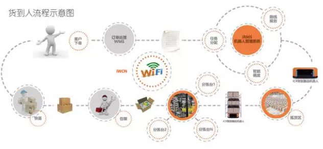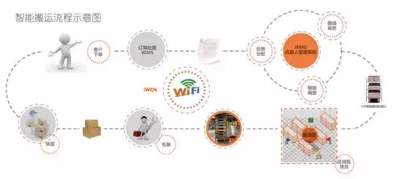 拣货区配置智能无线通信网络iWCN,机器人群体根据上述分配的任务,抗货架出发到拣货区