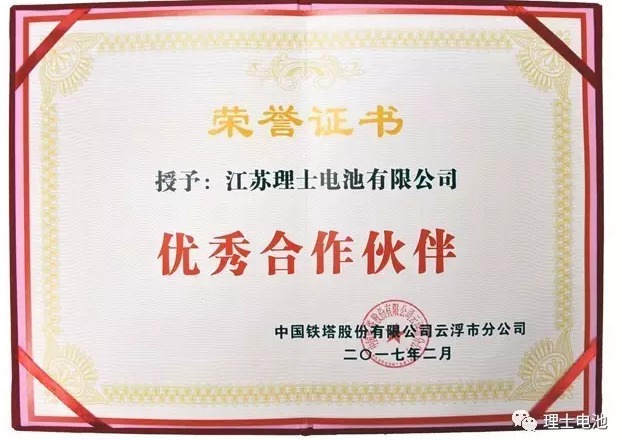 2017年2月6日,在中国铁塔股份有限公司云浮市分公司供应商颁奖暨2016年总结以及2017年工作计划大会上,江苏理士凭借卓越的品牌、快捷的交付、稳定的质量、优质的产品被授予“优秀合作伙伴”荣誉称号。