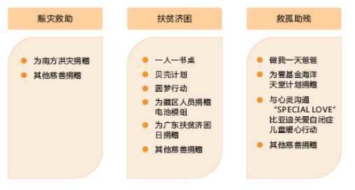 对于“小山村”的牵挂,比亚迪除了提供绿色科技产品外,更多的是在慈善公益活动方面不懈努力。数年前,比亚迪捐资设立了以“科技帮困、关爱弱小、携手助学,用心关怀,支持与推动企业慈善和社会公益事业的进步与发展”为宗旨的比亚迪慈善基金会。其慈善公益活动主要集中在赈灾救助、扶贫济困、救孤助残三大领域。