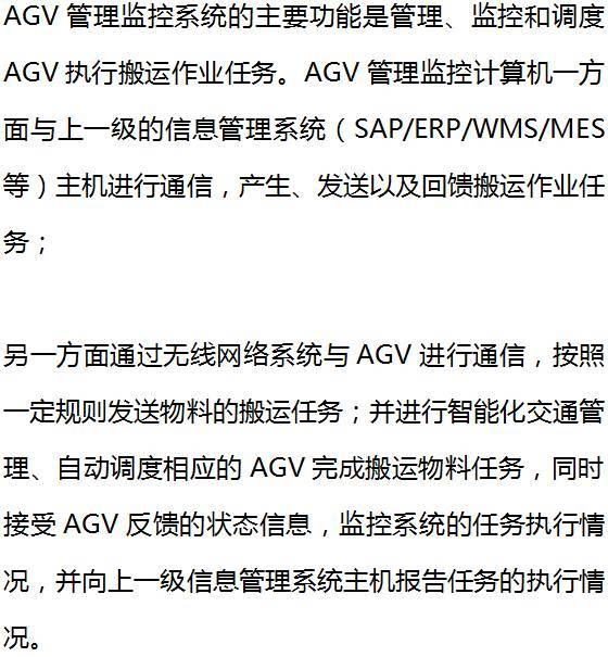 AGV系统中有多台AGV同时工作,为了指挥各台AGV按照AGV管理系统所接受的任务协调地工作,(即对AGV指派任务、进行交通管理等),所有的AGV以及系统中的其它自动化物流设备均由AGV管理监控计算机进行统一控制。