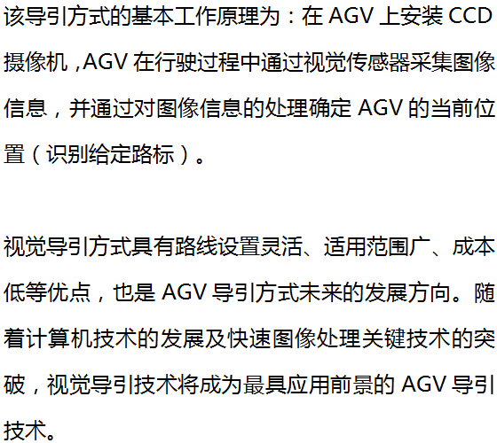 5)视觉导引技术及自然导航技术等将成为最具应用前景的AGV导引技术,开展快速图像处理关键技术的研究工作,开展图像处理技术在AGV导引技术上的适应性研究工作,尽快实现视觉导引等自然导引技术在工程中得以成熟应用。