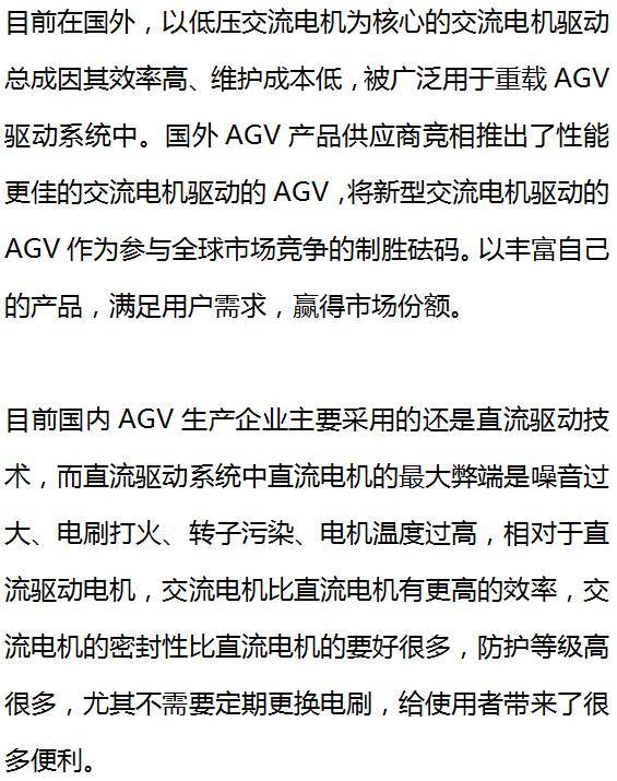 我国低压交流驱动控制技术在AGV中的应用才刚刚起步,市场前景将十分广阔。所以发展交流电机驱动AGV(特别是重载AGV),势在必行。