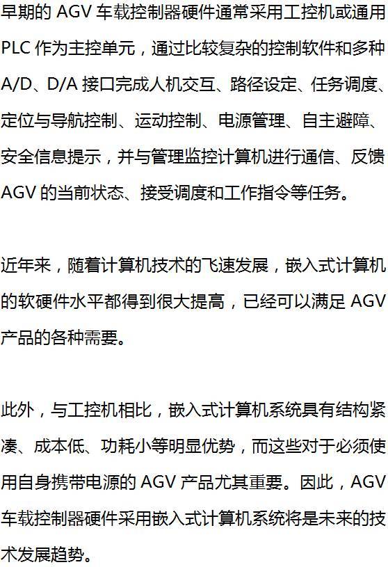 AGV车载控制器是AGV控制系统的核心,负责完成人机交互、路径规划、任务执行、定位与导航控制、电源管理、自主避障、安全信息提示,以及与AGV管理监控计算机进行通信,反馈AGV的当前状态,并接受AGV管理监控系统的调度和工作指令等任务。AGV车载控制器的性能和可靠性直接影响AGV产品的性能和可靠性。