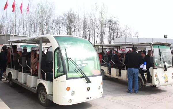 乘坐观光车准备参观工厂