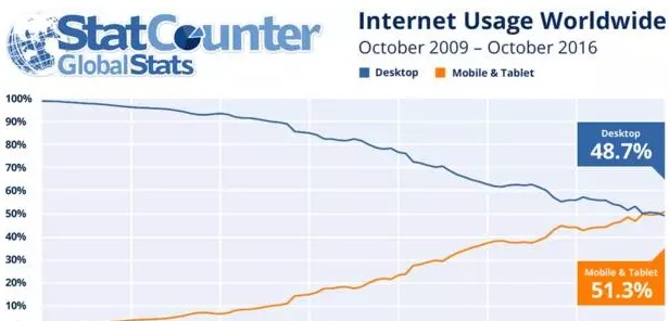 根据StatCounter数据,2016年10月全球智能手机和平板电脑占全球互联网使用量的51.3%,桌面端为48.7%。移动互联网的使用量在全球范围内首次超过了桌面互联网。如下图所示。在中日韩英等国家,移动互联网早已取得绝对的优势。例如,根据艾瑞咨询数据,2016年中国移动购物在整体网络购物交易规模中占比70.7%。这标志着,移动互联网时代在全球范围内全面到来,互联网发展进入后移动时代。