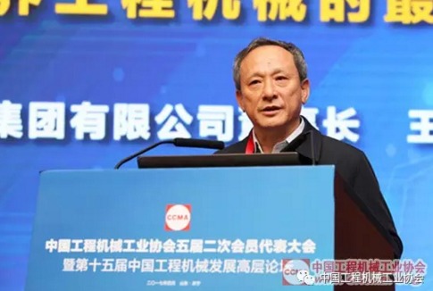 徐工集团董事长王民发表主旨演讲,主题是《不忘初心,坚定前行,努力攀登世界工程机械的最高峰》