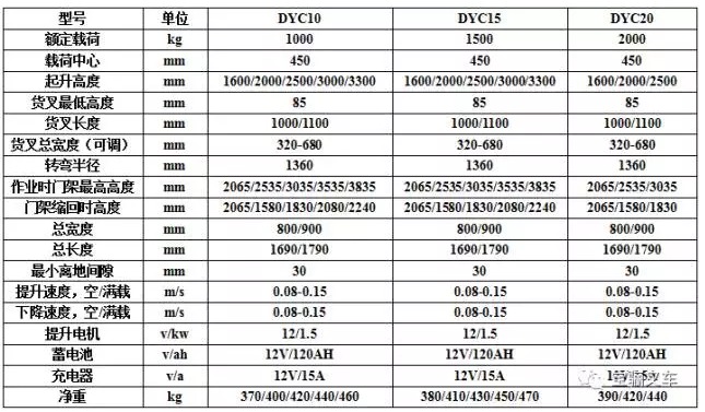 半电动堆高车的参数及配置: