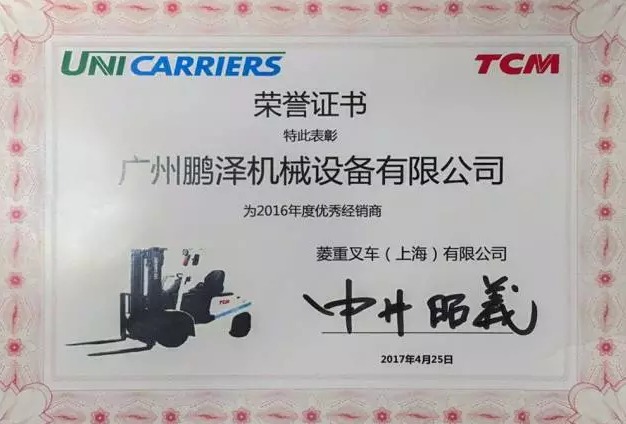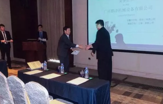 会上,佛朗斯股份董事长侯泽宽先生代表广州鹏泽接受了菱重叉车(上海)有限公司中井总经理颁发的 “2016年度优秀代理商”荣誉证书。