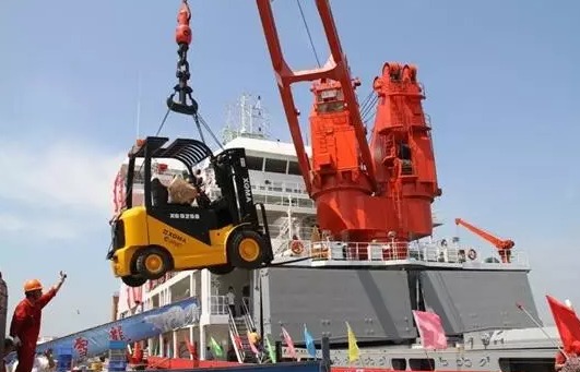 ▲厦工叉车正在吊装至雪龙号,远赴南极