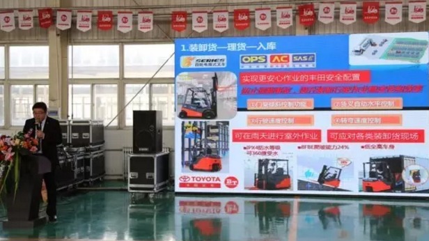 接下来,丰田产业车辆产品营销部邓琨先生向来宾们介绍了丰田产业车辆集团及其旗下的产品和服务,去年是丰田叉车母公司丰田自动织机成立90年纪念,90年历史沉淀的不仅仅是连续15年蝉联全球销量冠军的辉煌,更有以精益管理、精益制造、精益物流服务客户、贡献社会的企业理念。邓琨先生介绍道由丰田、BT、Raymond三大品牌构成的丰田产业车辆产品线正是在这样的理念下不断日臻完善的。在内部物流环节,丰田旗下产品线能为不同工况的室内物流作业提供高契合度、高品质的产品和解决方案。包括仓库设计、车辆选型、现场改善提案、高效点对点搬运解决方案、车队管理解决方案、拣选解决方案等。