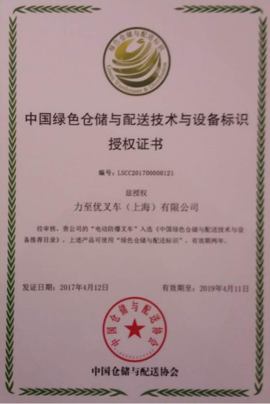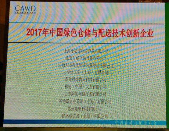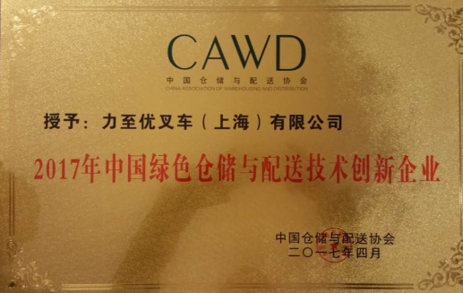 重庆物流展期间,为表彰力至优叉车对绿色环保事业长期做的贡献,中国仓储与配送协会授予力至优叉车(上海)有限公司2017年中国绿色仓储与配送技术创新企业称号。