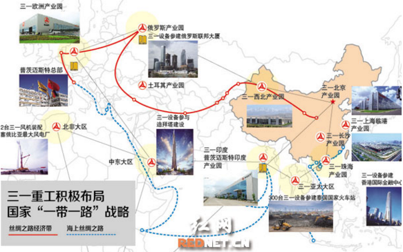 谈及“一带一路”国家战略时,湘企三一在中国企业“走出去”中,一直位居第一方阵——去年,三一重工实现国际销售收入92.86亿元,今年一季度,三一集团整个海外销售额同比增长30%,而海外十大区销售同比增长达到90%,其中俄罗斯大区增长超过400%,拉美大区增长超过300%,中东大区增长超过200%,东南亚大区增长近30%,亚澳大区增长10%以上。