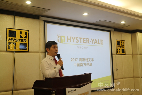 接下来由前海斯特产品经理周先生介绍海斯特产品情况。移式叉车保持平衡增长,源于国内企业对于仓储需求的增加与土地的紧缺,很多客户更改仓库的设计时,希望能把平面堆垛与两三层的低堆垛提高空间利用率,增加堆放物料的数量,所以前移式叉车需求在不断的增加中。所以本次主要介绍了两款新上市的产品与车队管理系统,国内组装的站驾式前移叉车及国内组装的电动托盘堆高车。