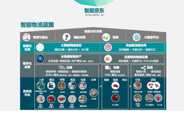 京东自07年起就开始自建物流,发展到现在,其供应链物流体系包括仓配一体、冷链物流、大件物流、国际供应链和供应链金融等服务。京东的智慧物流体系从仓、配、最后一公里等维度树立行业标杆。随着物流业的转型升级,物流企业对智慧物流的需求越来越强烈、 越来越多样化,今天我们从供应链体系梳理一下: