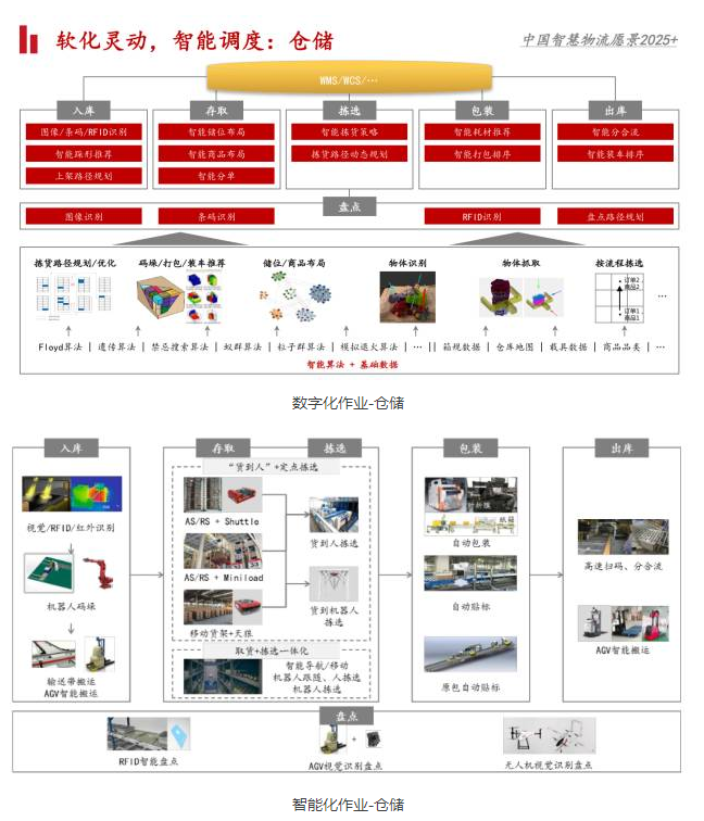 以存取和拣选环节为例:基于多层穿梭车技术的货到人拣选已经实现,未来将会应用拣选效率更高的货到机器人拣选方式,以及“取货+拣选一体化”的机器人拣选方式。