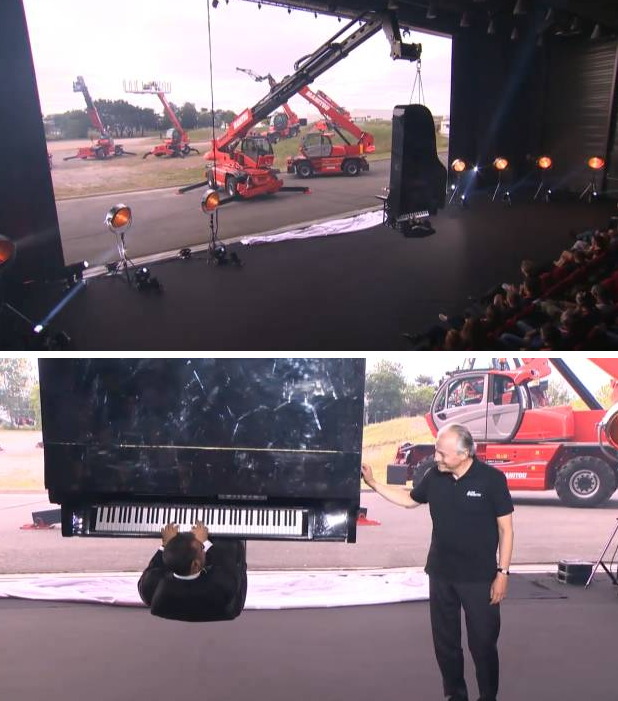 曼尼通伸缩臂上挂着一架钢琴和一位钢琴师?