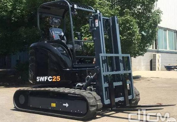 履带式叉车属于特种作业车辆,主要用于普通轮式叉车无法行驶和作业的崎岖路面上进行搬运和堆垛,市场上履带式叉车还是一片空白。2016年山河智能为客户定制开发了一款额定载重量为1000kg的SWFC10履带式叉车,用于户外太阳能板搬运、安装和拆卸,客户使用机器后非常满意,根据使用需求又追加了吨位更大的SWFC25履带式叉车订单。
