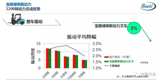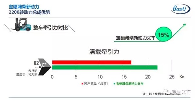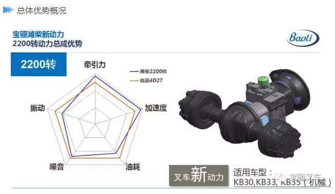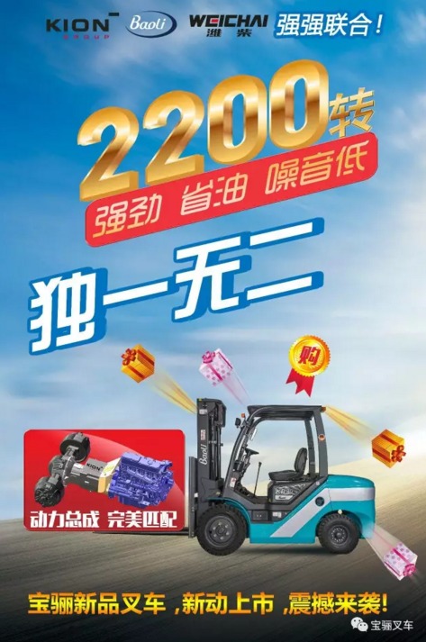 为了进一步践行宝骊的差异化战略,今年我们与潍柴合作,优化叉车核心部件:动力总成,通过无数次的试验与调配,最终将发动机、变速箱、驱动桥三者完美结合,研制了国内独一无二的宝骊专属的新型2200转动力总成,适用于宝骊2.5-3.5T机械内燃叉车。