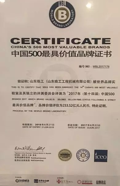 6月22日,2017年《中国500最具价值品牌》榜单在“世界品牌大会(World Brand Summit)”揭晓。在基于财务数据、品牌强度和消费者行为分析的年度报告中,山东临工以233.52亿元的品牌价值入围,排名升至176位,品牌价值同比上升34.85亿元。