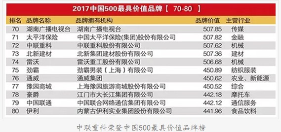 6月22日下午,由世界品牌实验室主办的第14届“世界品牌大会”在北京举行,会上隆重发布了2017年《中国500最具价值品牌》分析报告。国内装备制造龙头企业中联重科位列榜单第72位,这也是企业连续第14年入选该榜。此次公布的中联重科品牌价值为人民币507.63亿元,较上年的406.34亿元相比增长超100亿元。