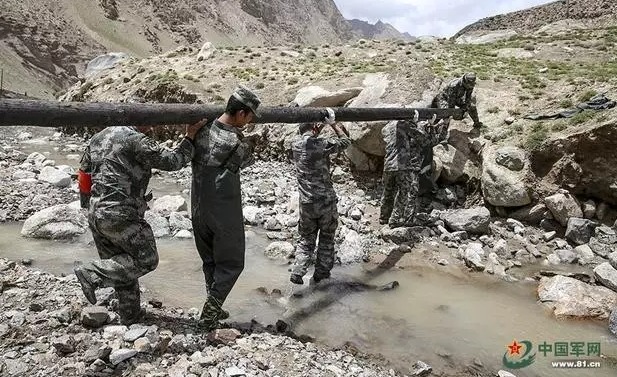 ▲官兵在泥石流区域进行光缆线路维护任务