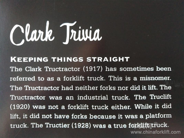 Clark Jniuia的意思是说:CLARK公司在1917年生产的Clark Tructractor,在很多情况下被人当成了叉车,其实这是用词不当,因为Tructractor这一款产品既没有货叉,也不能提升,所以Tructractor只能称得上是一款工业车辆,肯定不能称为叉车。CLARK公司还有一款产品,Truclift,于1920年(实际上是1922年)开发生产,同样也不能称为是叉车,因为这一款产品只是有一个可以提升的载货平台,并没有安装货叉。CLARK公司开发生产的第一台真正意义的叉车是在1928年推出的Tructier。