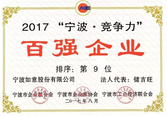 如意公司获评宁波•竞争力百强企业,排名第9位;宁波市制造业百强企业,排名第85位。