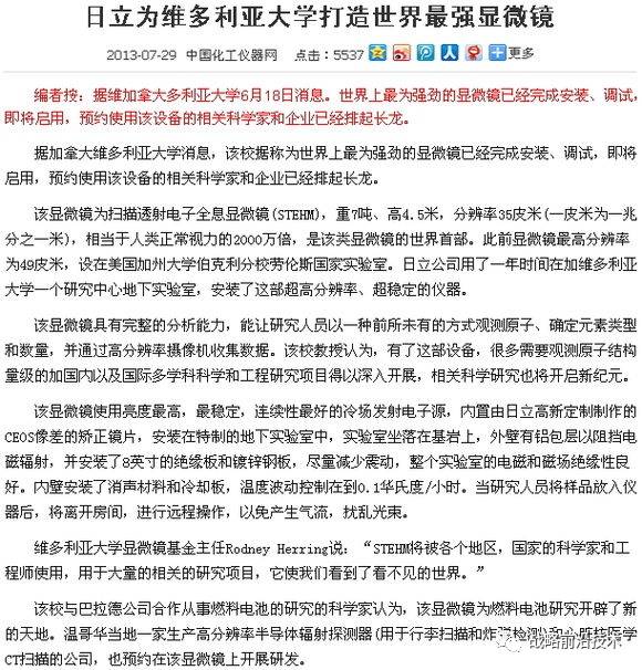 B、由日立为加拿大维多利亚大学定制打造的世界最强大的科研显微镜已于去年正式投入使用,分辩率35pm(1pm=1/1000nm),造价2500万美元——HF3300V STEHM(扫描透射电子全息显微镜)。