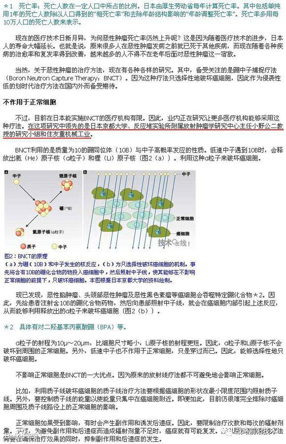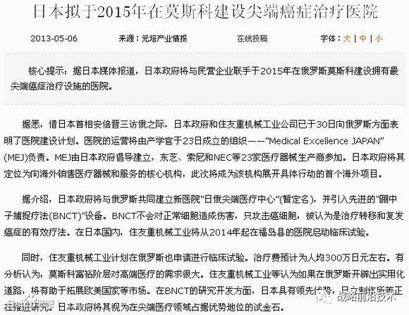 世界首个不依靠科研反应堆,成功商业化为医院专用的硼中子捕捉疗法(BNCT)设备——住友重机械 京都大学;BNCT是次世代最被关注的不需上手术台的癌治疗手段之一,日本产学界合作,率先于全球开发并实用化使用回旋加速器的BNCT设备可保证日本长期在尖端医疗器械领域位于不败之地。