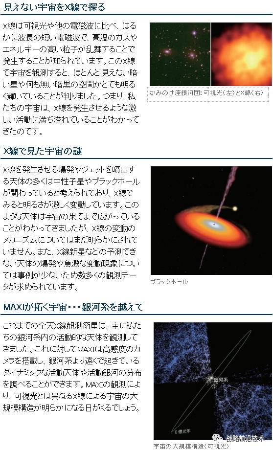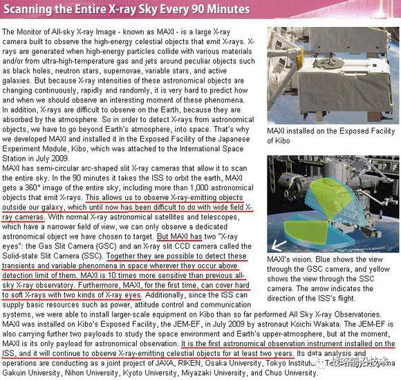 世界最速兼唯一有能力探测外银河系高能量的全天候天文仪器——maxi(全天候X射线监视装置);maxi搭载了由jaxa和riken共同开发的世界最广视野狭缝监视摄像机(12固态+2气态),放置于国际空间站