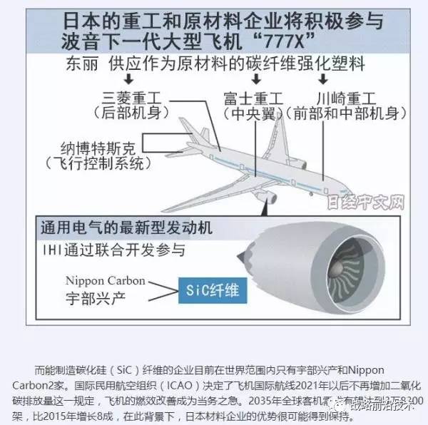 继碳纤维之后, 源自日本的新材料SIC纤维将又一次推动世界技术革新。新一代飞机的发动机核心零部件将采用日本开发的新材料。美国通用电气(GE)将在最新型发动机上采用日本厂商制造的重量轻、且具备高耐热性的碳化硅(SiC)纤维。宇部兴产等日本2家厂商供应。